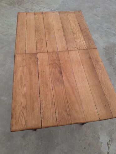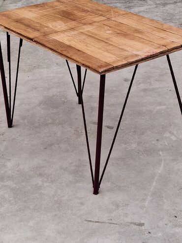 - Material: üst səth təbii ağac lövhələrdən, səth teksturası və lifləri görünən; ayaqlar metal konstruksiyalıdır.