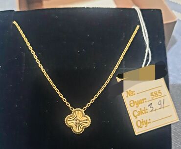 Zərif qızıl boyunbağı – klovers (dördyarpaqlı yonca) asqısı ilə. - Material: 14 ayar qızıl (etiketdə “14k/14 ayar” qeyd olunub) - Çəki: 2.35 qram (etiket məlumatı) - Dizayn: mərkəzdə dördyarpaql...