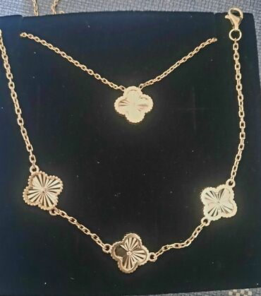 Qızıl rəngli zərif boyunbağı - Dizayn: Dördyarpaqlı yonca formalı asma, hər yarpaq üzərində relyefli naxışlar - Zəncir: İncə, ikiqat zəncir quruluşu; hər iki tərəfdə dekorativ bəzək muncuqları - Q...