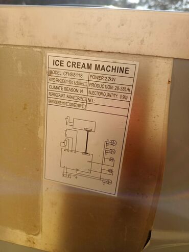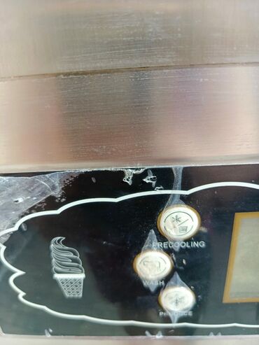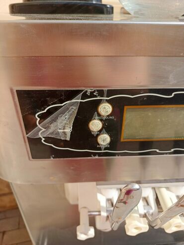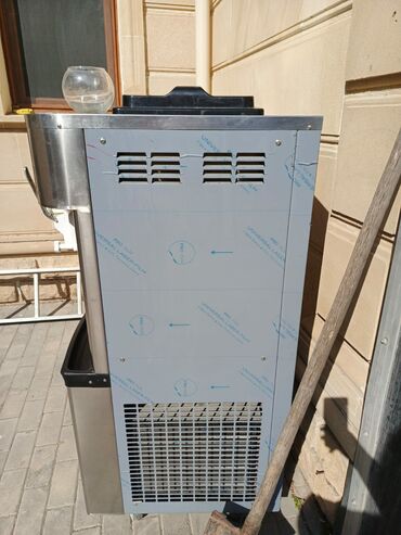 Soft dondurma aparatı – paslanmayan poladdan korpus, üç kranlı paylama sistemi (iki ləzzət + miks). Ön paneldə LCD ekran və idarəetmə düymələri: Pre-cooling (ön soyutma), Wash (yuma), Produce (istehsal). Üst hissədə iki qapaqlı bunker (qarışıq üçün), aşağıda kompressor bölməsi və ventilyasiya barmaqlıqları. Elektriklə işləyən, stasionar tip (döşəməüstü). Ön hissədə “Ice Cream” stikerləri, paylayıcı qollar metal, çıxarılan plastik başlıqlar təmizliyə uyğundur. Arxa paneldə servis üçün çıxarılan örtük və hava dövranı üçün barmaqlıq var. Kafe, restoran və küçə satışları üçün çoxnövlü soft dondurma hazırlanmasına uyğundur.