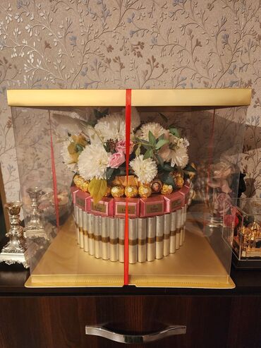 Qutusu ilə birlikdə. Mərkəzdə süni çiçəklərdən (ağ xrizantema, açıq çəhrayı qızılgül və yaşıl yarpaqlar) ibarət dekorativ buket.Yan tərəfdə qızılı və gümüşü folqa ilə bükülmüş konfetlərdən hazırlanmış “üzüm salxımı” dekoru.