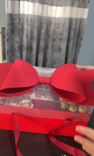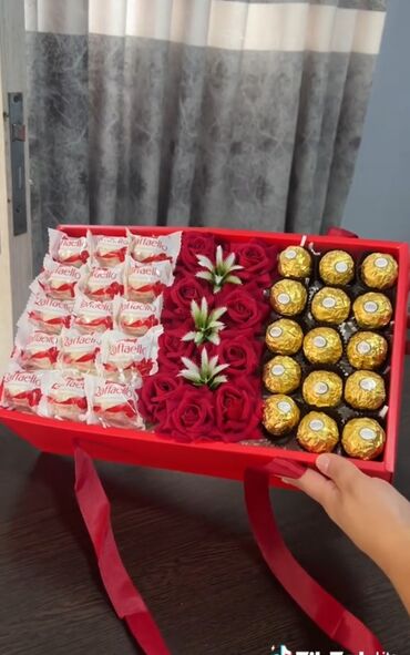 - Dördbölməli hədiyyə qutusu variantı: bir bölmədə Raffaello konfetləri, birində Ferrero Rocher, ortada gül zolaqları
