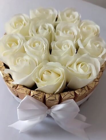 - Ağ güllər + qızılı baton şokoladlı mini kompozisiya