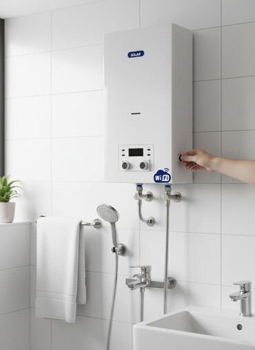 Mətbəx və ya vanna otağı üçün stabil isti su təminatı, enerjiyə qənaətcil işləmə və rahat uzaqdan idarəetmə üçün ideal. Model üzərində “WiFi” nişanı və SOLAR loqosu mövcuddur.