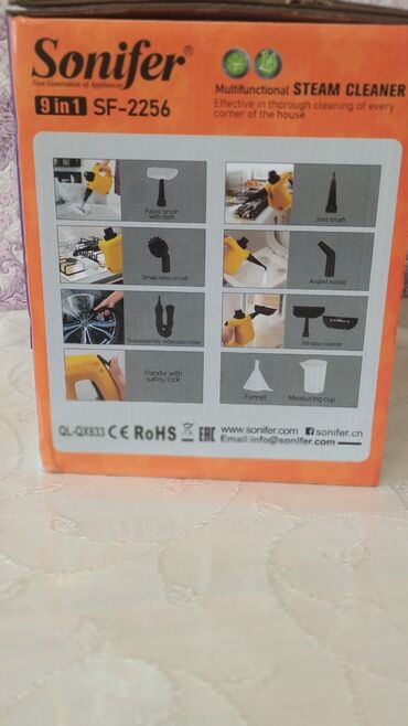 Ekoloji təmiz buxar texnologiyası ilə kimyəvi maddəsiz dərin təmizlik. 14 ay rəsmi qeyd (qutuda göstərilib). CE, RoHS, EAC işarələri. Kompakt, əlcək tutacaqlı dizayn.
