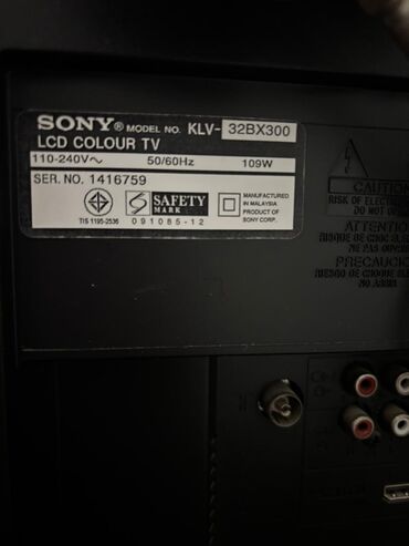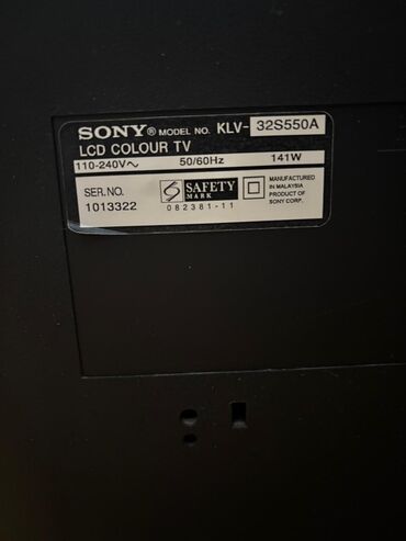 Sony LCD televizor – model KLV-32S400A - Ekran: 32 düym LCD Colour TV - Giriş gərginliyi: 110–240V~ - Tezlik: 50/60Hz - Güc sərfiyyatı: 156W - Seriya nömrəsi: 1904488 (etiketdə göstərilib) - İsteh...