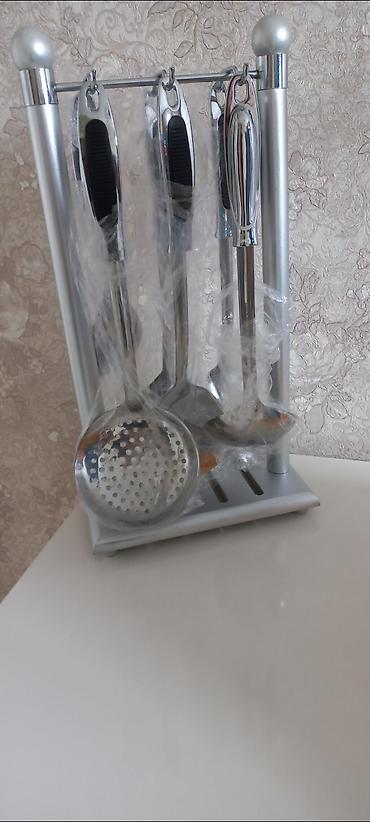 - Tərkib: asqılı stend və 5 ədəd paslanmayan polad alət (kepçe, dəlikli süzgəc qaşığı, sous kepçesi və s. – şəkilə uyğun)