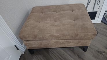 - Yumşaq oturacaqlı puf/otomanka: kvadrat formalı, açıq qəhvəyi rəngdə süet‑effektli parça ilə üzlənmişdir. Üst hissədə düyməli (kapitone) tikişlər var, kənarları səliqəli ədviyyə tikişi ilə işlənib. Qalın yastıq qatlı oturacaq rahat ayaqaltı və əlavə oturacaq kimi istifadə oluna bilər. Tünd rəngli, möhkəm taxta ayaqlar stabiliyi artırır. Zal, yataq otağı və ya giriş üçün uyğun ölçüdə, müasir və neytral dizayn.