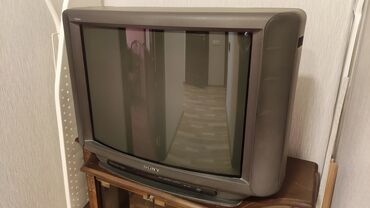 Sony katod şüalı (CRT) televizor - Marka: Sony - Korpus: tünd boz, ön paneldə mexaniki idarəetmə düymələri və IR pult qəbuledicisi - Ekran: təxminən 21–25 düym diaqonal, düzə yaxın ekran - Səs: ön...