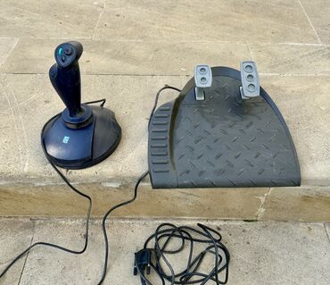 - Joystick + pedal dəsti: sükan/aviator tipli joystick, üst hissəsində bir neçə idarəetmə düyməsi var; ayrıca iki pedallı ayaq platforması. Kabel qoşulmaları görüntüdədir.