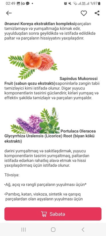 - Sapindus Mukorossi Fruit (sabon qozu): təbii saponinlərlə kirləri yumşaq və effektiv təmizləyir, parçaları yumşaldır.