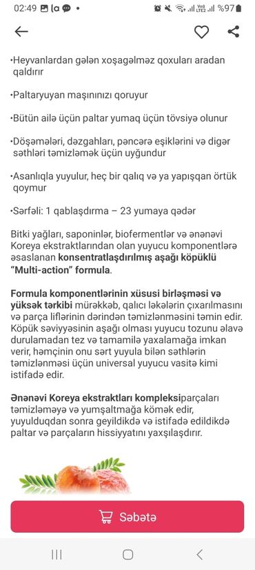 - Aşağı köpüklü “Multi-action” formula: həm paltarlar, həm də sərt yuyula bilən səthlər üçün.
