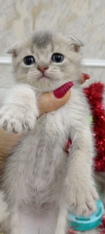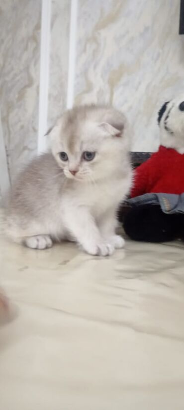 Skottiş Fold balası, cinsi erkək. Qum tərbiyələri var. 2 aylığ və çox mehribandırlar☺️ - Cins: Scottish Fold (qulaqları qatlanmış) - Rəng: gümüşü-boz tabby (zolaqlı), yumşaq və tüklü kürk - Gözlər...