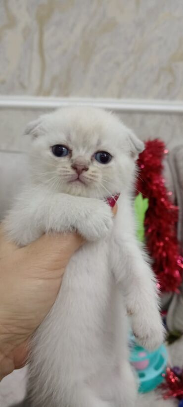 Saf ağ rəngli, göy gözlü balaca pişik balası. Qulaqları yığcam/qatlanmış tipdədir. Tam sağlam toppuş baladir
