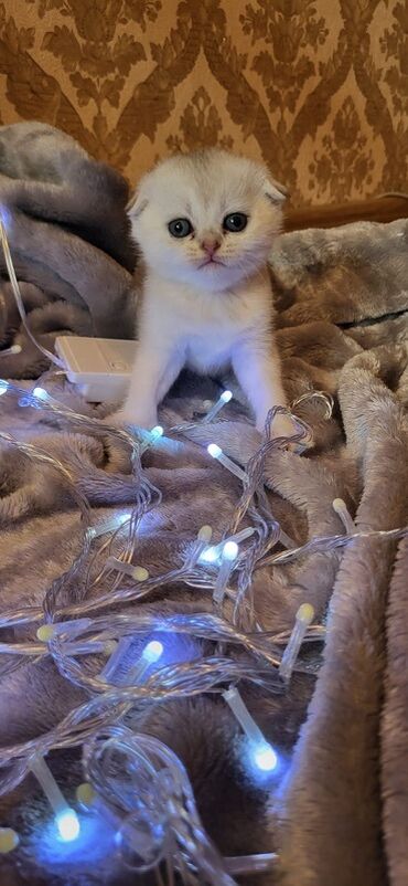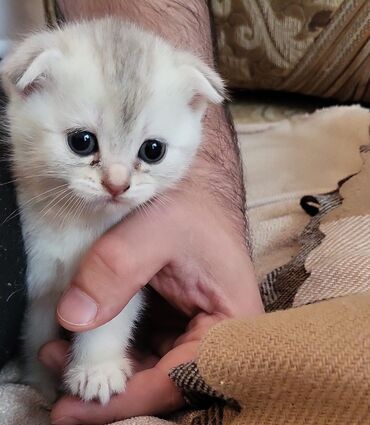 Şotland qatlanaqlı balaca pişiklər - Cins: Scottish Fold/Scottish Straight qarışığı (şəkillərdə qıvrıq qulaqlı və düz qulaqlı balalar var) - Rənglər: tam ağ, ağ-çəhrayı çalarlarla, başında boz lək...