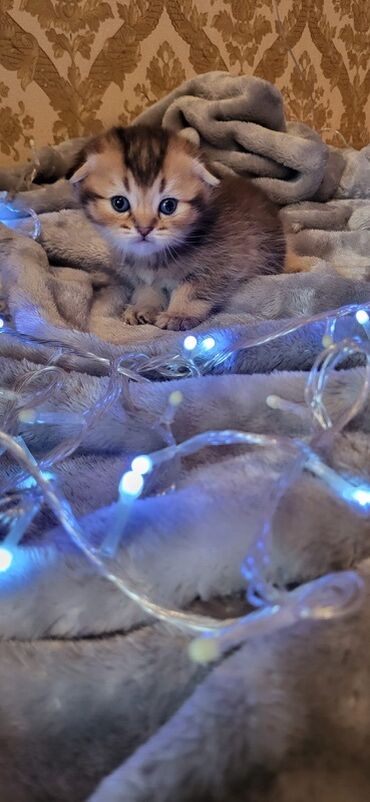 Skotiş qıvraq qulaqlı balaca pişik balası - Cins: Scottish Fold (qıvraq qulaqlı) - Rəng: gümüşü-boz, zolaqlı/xallı tabby naxışları - Xəz: yumşaq, qısa və parlaq - Gözlər: iri, ifadəli - Xarakter: ...
