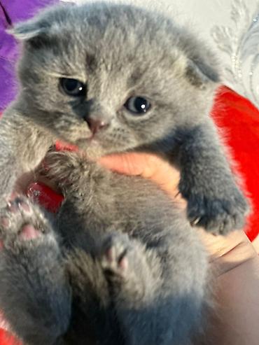 Şotlandiya fold balaları – boz (blue) rəngli, yumşaq, sıx yun örtüklü, iri yuvarlaq gözlü. Qıvrıq-qulaqlı tipik fold quruluşu, qısa pəncələr və kompakt bədən. Şəkillərdəki balalar sosialdır, qucaq və oyun sevərlər; ev şəraitində böyüdülür, pişik cızma dirəyi və oyuncaqlara öyrəşdirilir. Hipoallergen olmayan sırf ev pişiyi üçün uyğun cinsdir, sakit xarakterli, uşaqlarla rahat ünsiyyət qurur. Qidalanma: keyfiyyətli yaş/quru yemlərlə tədricən qarışıq rasion. Tualet vərdişləri qazandırılıb, qum qabına gedirlər. Rəng çaları: monoxrom bozdan açıq krem-boza qədər. Profilaktik baxım üçün fırçalanmanı qəbul edirlər, dırnaq qayçısına alışdırılırlar. Şəkildəki pişikboynu qayışı və zəngli aksessuar uyğun ölçüdədir. Evə tez uyğunlaşan, sakit və mehriban yoldaş axtaranlar üçün ideal ailə pişiyi.
