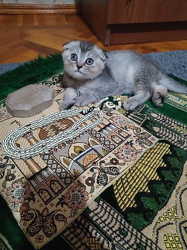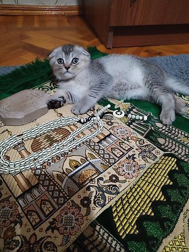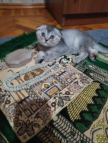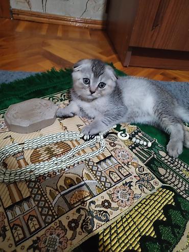 Skottiş Fold balası – şirin “fold” qulaqlı - Cins: Scottish Fold (qıvrıq qulaqlı) - Yaş: baladır - Rəng: tünd-qəhvəyi tabbi (zolaqlı), sinəsi və ağız ətrafı açıq rəng - Gözlər: iri, boz-mavi tonlu...