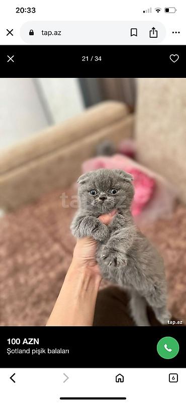 Skottiş Fold balası – şirin “fold” qulaqlı - Cins: Scottish Fold (qıvrıq qulaqlı) - Yaş: baladır - Rəng: tünd-qəhvəyi tabbi (zolaqlı), sinəsi və ağız ətrafı açıq rəng - Gözlər: iri, boz-mavi tonlu...