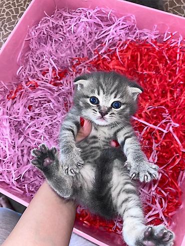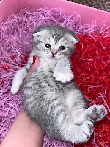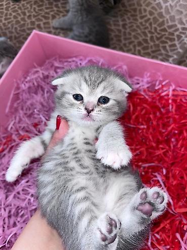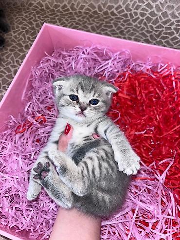 Sakit və mehriban xasiyyətli, qıvrıq-qulaqlı şotland tipli boz zolaqlı pişik balaları.