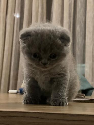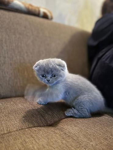 Məhsul: Scottish Fold balası (qıvrıq qulaqlı) Rəng: Solid boz (blue) Yun: Qalın, yumşaq, qısa tüklü Gözlər: Dairəvi, mavi-boz tonlu Qulaqlar: Irəli və aşağı qatlanmış tipik Scottish Fold quruluşu B...