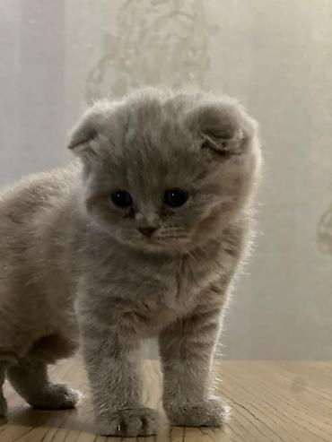 Şotland qıvrımqulaq (Scottish Fold) bala pişik - Rəng: açıq boz (blue/grey) - Qulaqlar: tipik qatlanmış - Gözlər: açıq rəngli, iri və ifadəli - Yelşün: yumşaq, sıx tüklü - Xasiyyət: sakit, mehriba...