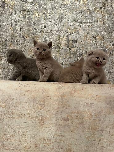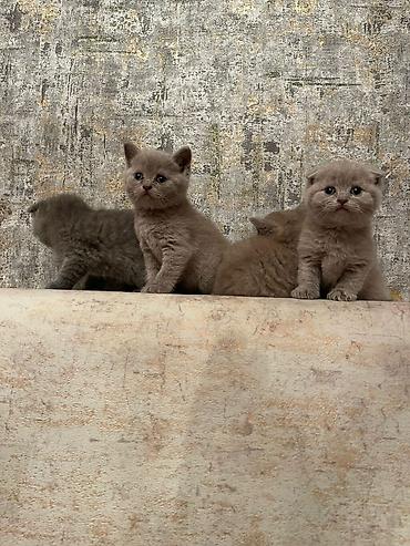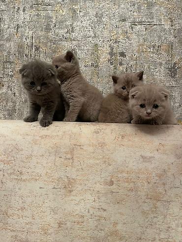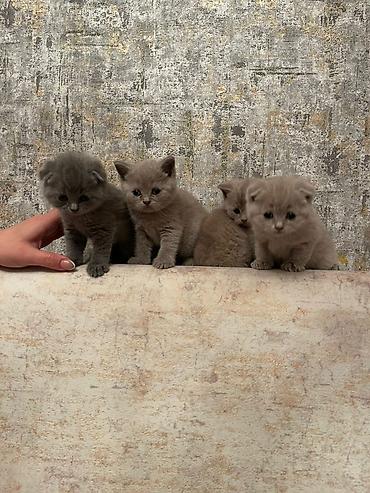 Skotş Fold balaları – boz (blue) rəngli, yumşaq, sıx tük örtüyü və tipik qatlanmış qulaqlar. Fotoşəkillərdə ana pişik də görünür. Xüsusiyyətlər: - Cins: Scottish Fold - Rəng: solid boz/blue - Qul...