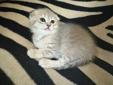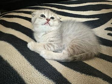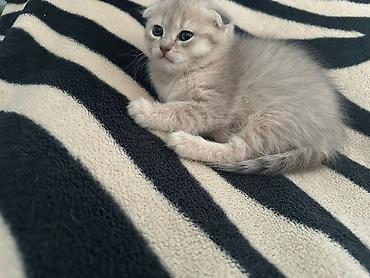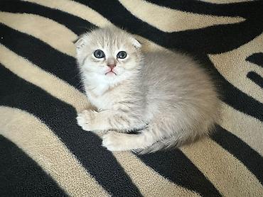 Britan tipli qatlanaqlı qulaqlı balaca pişik (Scottish Fold görünüşlü).