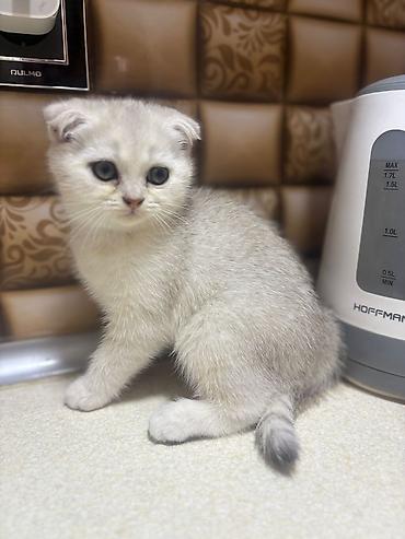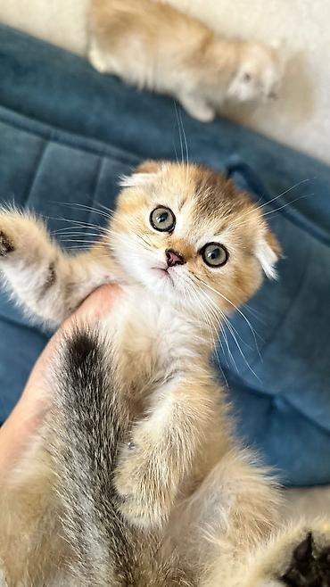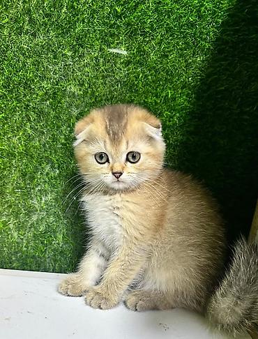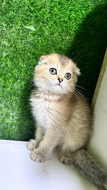 Skottiş Fold balaları – qızılı “golden shaded” rəng palitrası və böyük, yumru yaşıl-gri gözlər. Qıvrıq (aşağı) qulaqlar, qısa-orta uzunluqda yumşaq, sıx tük örtüyü, qalın “pompom” quyruq. Miniatür, kompakt bədən quruluşu, enli yanaqlar və düz, kiçik burun profili ilə cins xüsusiyyətləri aydın görünür.