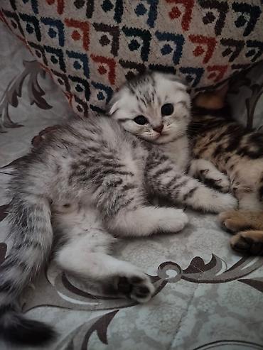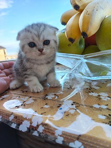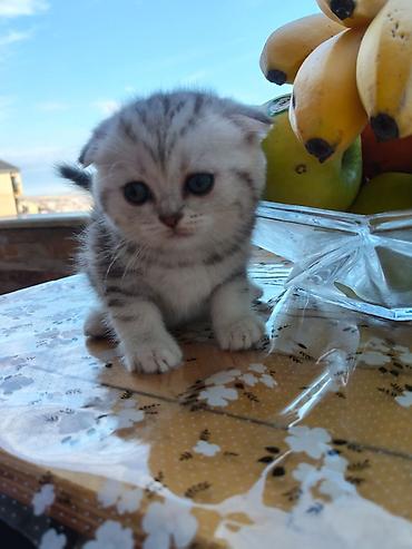 Şotland qıvrımqulaq (Scottish Fold) balaları - Növbənöv rənglər: açıq krem-ağ xallı, gümüşü tabby (boz zolaqlı) - Qulaqlar: tipik qıvrım (folded) - Gözlər: iri, ifadəli, tünd yaşıl-boz tonlarında ...