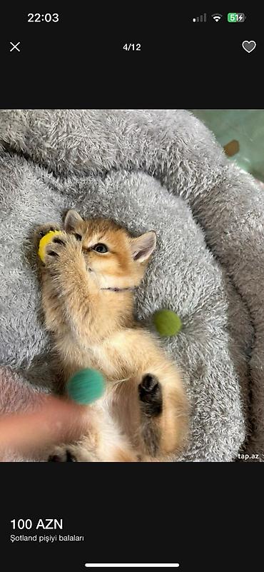 Şəkildə göstərilən elan görüntüsündə qiymət: 100 AZN (Şotland pişiyi balaları) görünür.