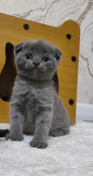 Şotland qıvrıqqulaq (Scottish Fold) balası - Rəng: açıq boz (blue/grey) bərk ton - Qulaqlar: qatlanmış - Tük quruluşu: yumşaq, sıx və puf - Gözlər: mavi-boz çalar - Xasiyyət: sakit, mehriban, quca...