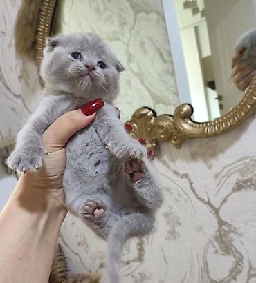 Skotiş Fold balaları – boz (blue) rəng - Cins: Scottish Fold (qatlanmış qulaqlı) - Rəng: Bütöv boz (blue), bərabər tonlu, yumşaq və sıx tüklü - Xarakter: Ailəyə uyğun, mehriban, sakit və tez uyğun...