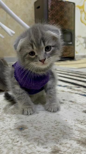 Şotland qıvrımqulaq balası – boz (blue) rəng - Cins: Scottish Fold (qıvrımqulaq) - Yaş qrupu: bala - Rəng: bərk boz/blue, qısa, qalın və ipək kimi tüklər - Qulaqlar: klassik qatlanmış - Gözlər: iri...