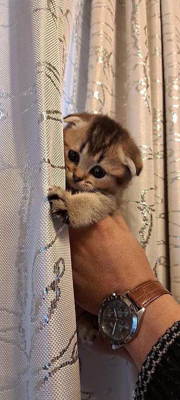 Scottish Fold balaca pişik balası - Cins: Scottish Fold (qatlanan qulaqlı) - Rəng: krem/ağ tonlarda, yumşaq və sıx tük örtüyü - Gözlər: böyük, tünd/mavi-boz çalarlar - Xüsusiyyətlər: sakit və mehr...
