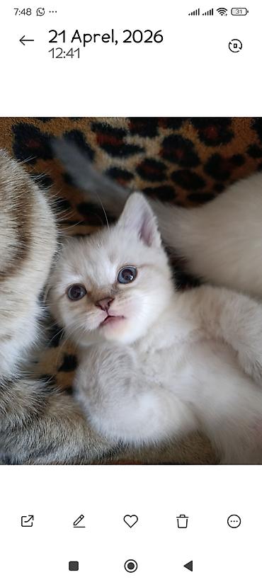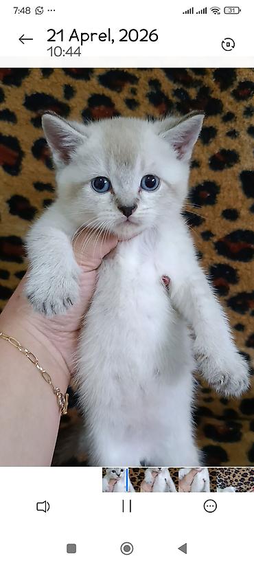 Gümüş rəng çalarlarında, iri xəzli, mavi-yaşıl gözlü balaca Scottish tipli (bəziləri qıvrıq/qulaqları yatan) pişik balaları. Xüsusiyyətlər: - Rəng: gümüş shaded/smoke, bədəni açıq krem-boz, quyruq...