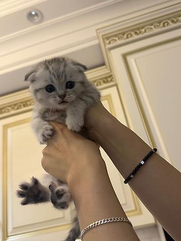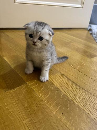 Şotland qıvrımqulaq (Scottish Fold) balaları - Növbənöv rənglər: açıq krem-ağ xallı, gümüşü tabby (boz zolaqlı) - Qulaqlar: tipik qıvrım (folded) - Gözlər: iri, ifadəli, tünd yaşıl-boz tonlarında ...