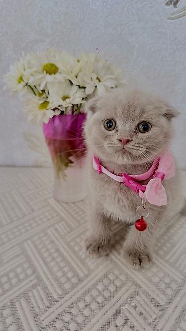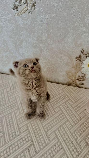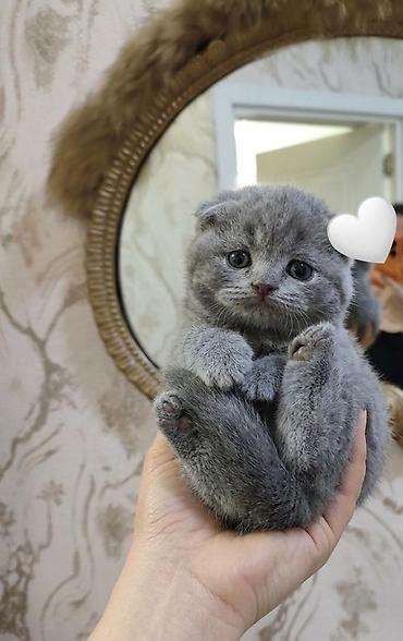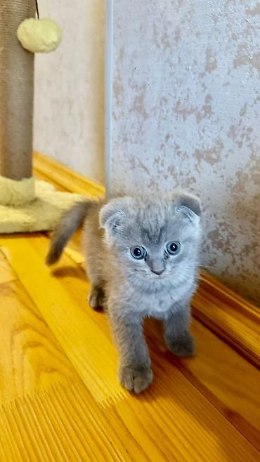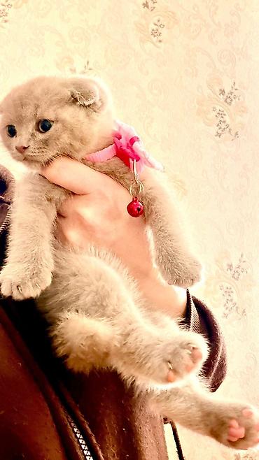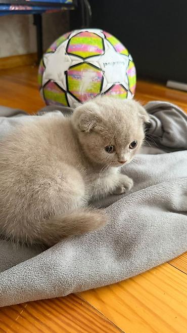Şotland qıvrıqqulaq (Scottish Fold) balası - Rəng: açıq boz (blue/grey) bərk ton - Qulaqlar: qatlanmış - Tük quruluşu: yumşaq, sıx və puf - Gözlər: mavi-boz çalar - Xasiyyət: sakit, mehriban, quca...