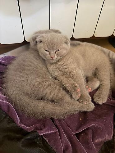 Skotiş Fold balaları – boz (blue) rəng - Cins: Scottish Fold (qatlanmış qulaqlı) - Rəng: Bütöv boz (blue), bərabər tonlu, yumşaq və sıx tüklü - Xarakter: Ailəyə uyğun, mehriban, sakit və tez uyğun...