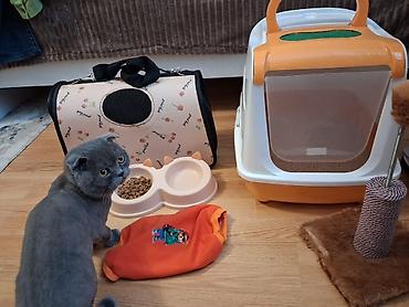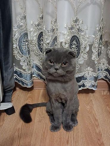 Skottiş Fold pişiyi - Cins: Scottish Fold (qulaqcıqları qatlanmış) - Rəng: bərk boz (blue/boz təkrəng) - Gözlər: tünd, ifadəli - Xasiyyət: sakit, mehriban, ev şəraitinə tez uyğunlaşır; insanla üns...