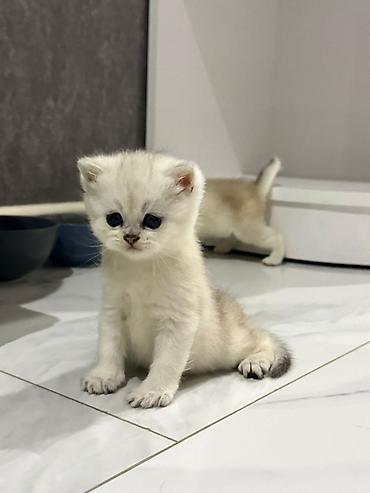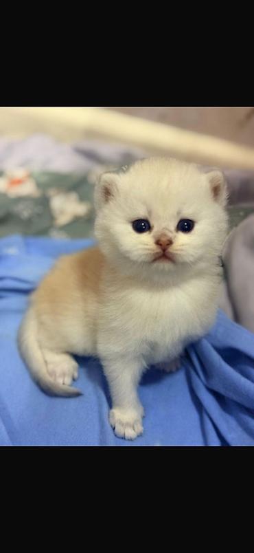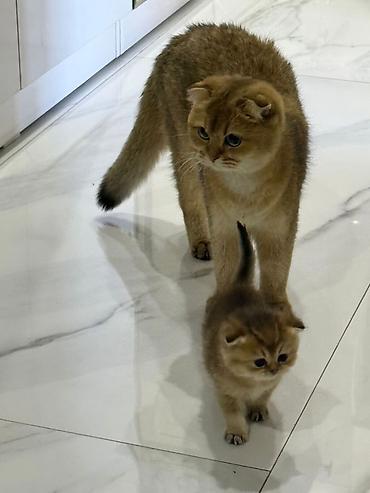 - Nəsil: Şotland tipli britan pişiyi (ana – qızılı shaded Scottish Fold, fotoda görünür; balalarda həm fold, həm straight qulaq forması mövcuddur)