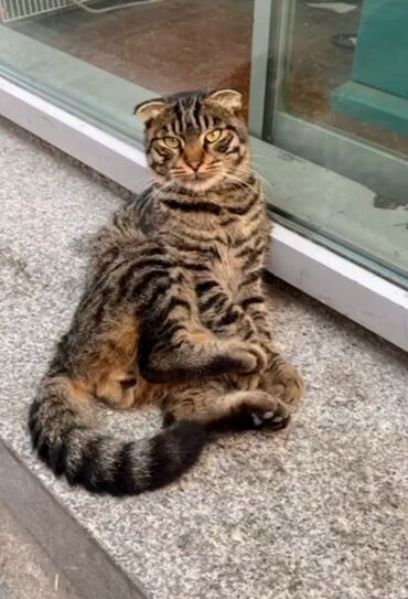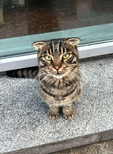 Skotish Fold (qatlanan qulaqlı) pişik - Rəng: tünd tüstü/qarışıq tabby naxışlı - Gözlər: parlaq qızılı - Kürk: qısa, sıx və parıltılı - Qulaqlar: klassik “fold” forması - Quyruq: uzun və tüklü, bə...