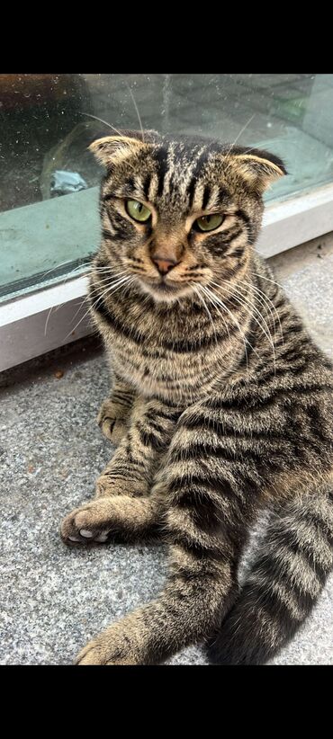 Skottish Fold (qatlananqulaq) pişiyi - Cins: Scottish Fold, qısa tüklü - Rəng: tünd qəhvəyi boz tabby (xətli naxış), qarın və pəncələrdə açıq tonlar - Gözlər: iri, bal rəngi - Qulaqlar: klassik qa...