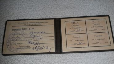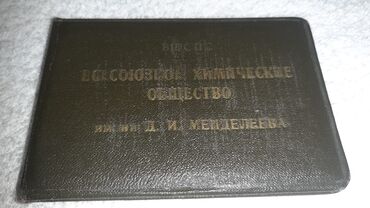 Sovet dövrünə aid üzvlük vəsiqəsi – D. İ. Mendeleyev adına Bütümittifaq Kimya Cəmiyyəti (VXO). Xüsusiyyətlər: - Qara rəngli, üzərində qızılı rəngli yazılar olan cüzdan tipli örtük. - Daxildə rus d...
