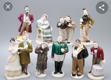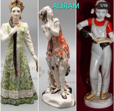 - Müxtəlif zavodlara aid incə işləməli porcelan heykəlciklər: milli geyimli qadın fiqurları, uşaqlar, işçi və sənət mövzuları, tematik kompozisiyalar (məsələn, satirik obrazlar toplusu). Rəngləmə əl işidir, detallarda qızılı naxışlar və zəngin ornamentlər var.