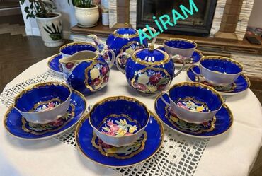 - Porcelan çay servisi: kobalt-mavi fonlu, güllü və qızılı konturlu qablar. Komplektdə çaydan, südqabı, şəkərqabı, fincan-nəlbəki dəstləri var. Dərin mavi rəng, iç səthlərdə incə perlemut parıltı, kənarlarda zərif qızıl işləmə.