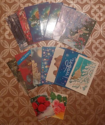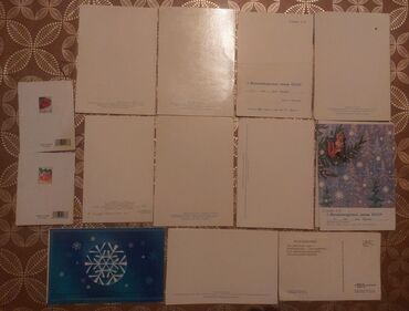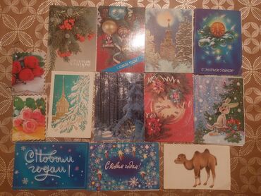 - Yeni il və qış mövzusunda müxtəlif illüstrasiyalı sovet dövrü poçt kartları: şam budaqları, saat, meşə mənzərəsi, Spasskaya qülləsi, “С Новым годом!” yazıları və bayram ulduzları.