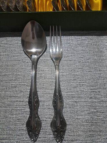 Melxior 100böyük qaşıq, 100böyuk çəngəl, 100 desert qaşıq ,100vilka desert ,100 bıçaq böyük bıçaq desert , bıçaqlar karobkasinda, 100 çay qaşiğı,Mürəbbə qaşiğı 6,10 ədəd limon göturən , hamısını ...