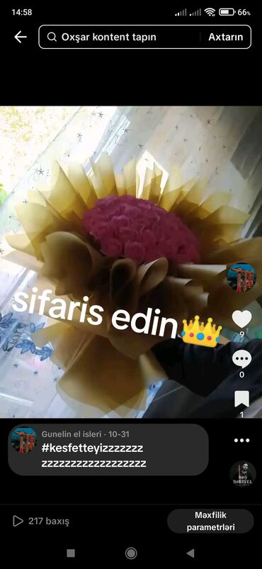 Əlavə olaraq: əl işi gül buketi – dekorativ, hədiyyəlik kompozisiya. “Sifariş edin” qeydi şəkildə göstərilib.