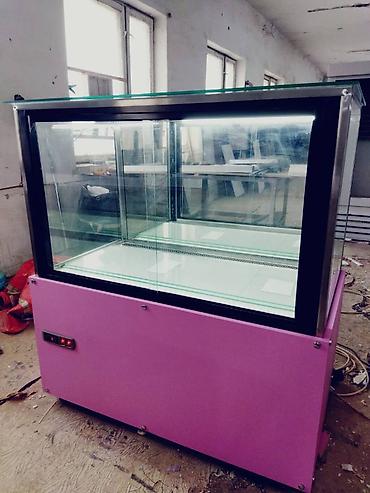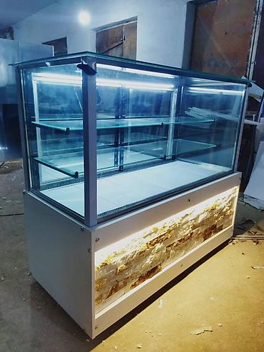 Ölçülər təxmini: orta ölçülü vitrin (şəkildə emalatxana şəraitində göstərilib), ön ekspozisiya şüşəsi geniş bucaqla görünür. Rəng: bənövşəyi alt panel + şəffaf şüşə